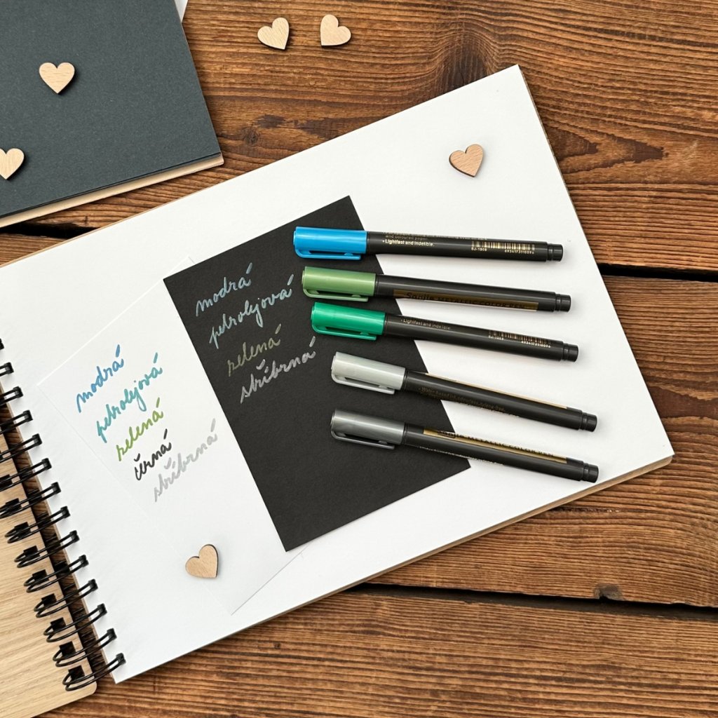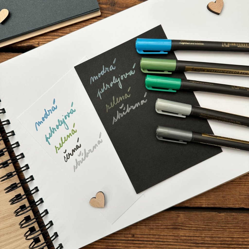 - barvy: modrá, petrolejová, zelená, stříbrná a černá