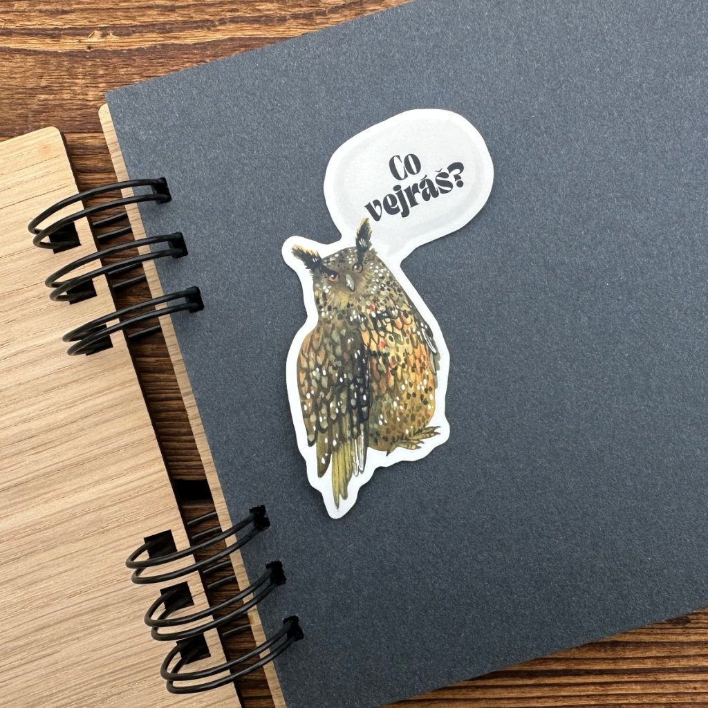 Samolepka s originální kresbou výra velkého a humorným nápisem „Co vejráš?“ je precizně vyřezaná do tvaru samotné ilustrace. Vyrábí se z odolného PVC a je chráněná matnou laminací, která jí dodává vysokou životnost. Díky této úpravě bez problémů zvládá kontakt s vodou a vlhkostí, slunce i nepříznivého počasí. Odolá také poškrábání, oděru a jen tak se neroztrhne.