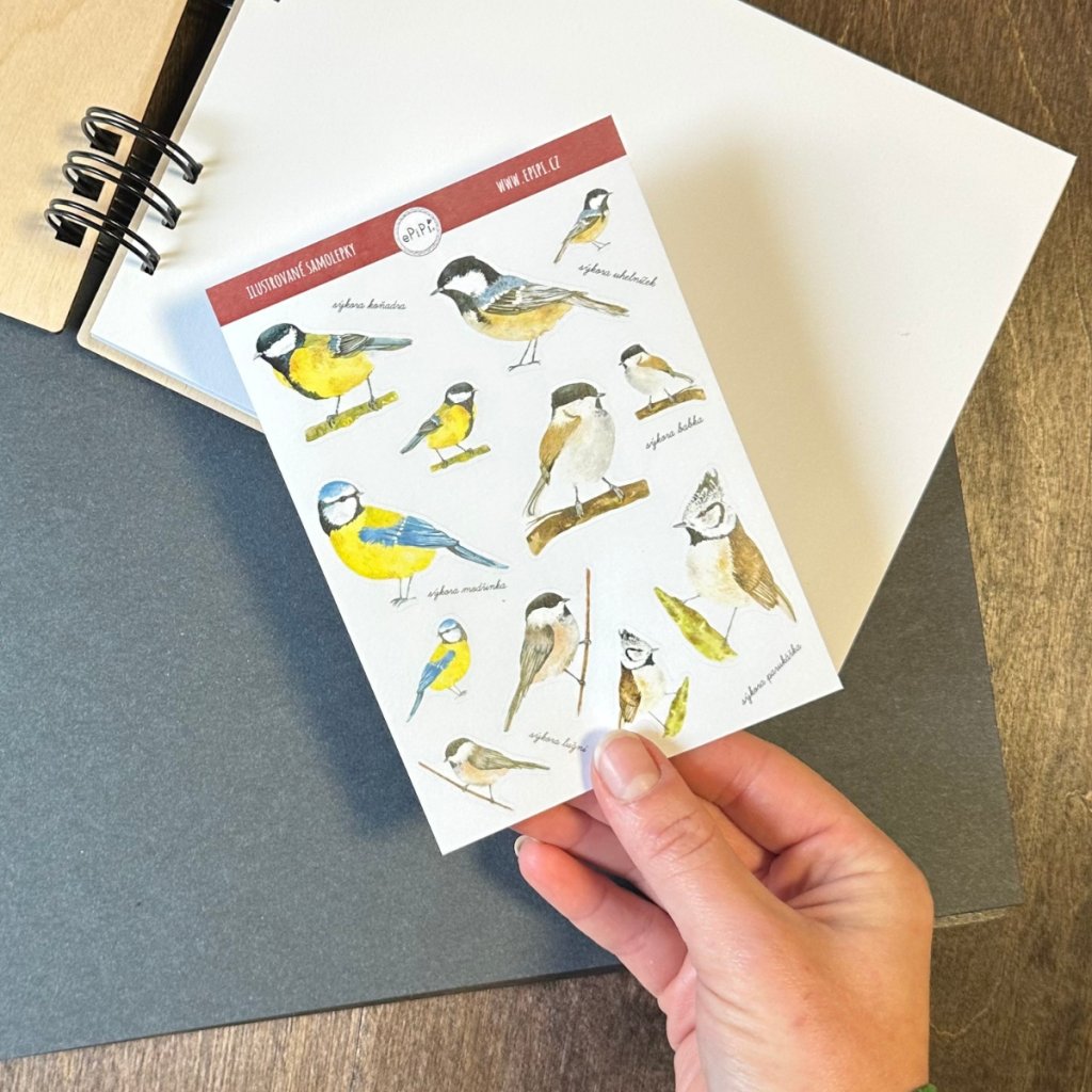 Arch papírových samolepek s šesticí druhů sýkor (koňadra, uhelníček, modřinka, babka, lužní a parukářka). Jsou ideální do diáře, plánovače, fotoalba i k ozdobení dalších povrchů, které chcete oživit drobnými ilustracemi ptáčků.